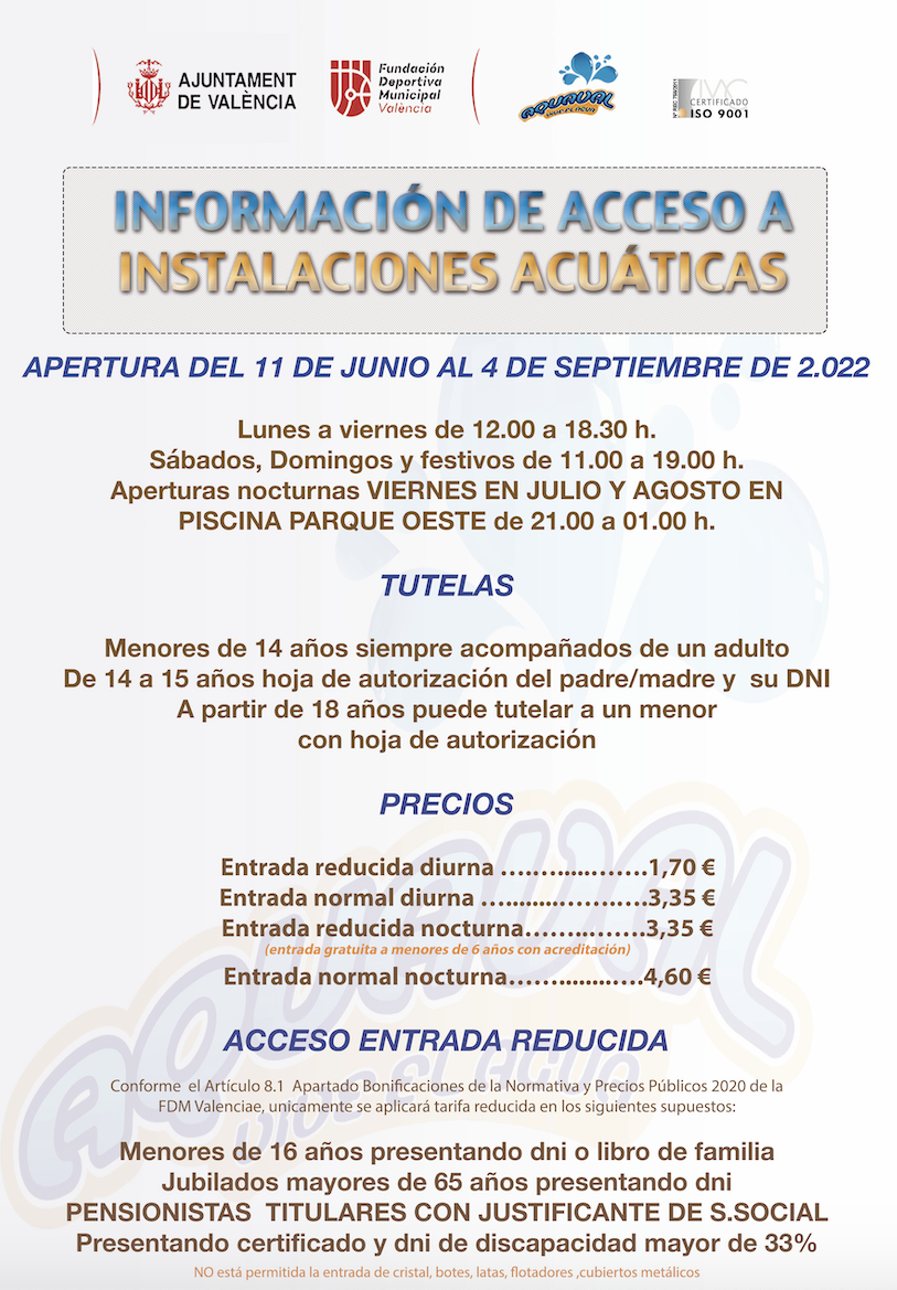 Aquaval se reserva el derecho de cerrar la instalación por causas excepcionales basadas en motivos meteorológicos adversos, de aforo, seguridad y/o salud pública, así como Campeonatos de Natación o eventos. No hay devolución de entradas por motivos meteorológicos. También se reserva el derecho a modificar la fecha de cierre de la instalación sin que de todo ello derive la obligación de la devolución del dinero. Toda causa excepcional que pueda derivar en el cierre de la instalación se publicará con antelación en las redes sociales, en esta web y en la propia piscina. Las devoluciones que gestione Aquaval llevarán un máximo de 2.50€ de gastos de gestión.