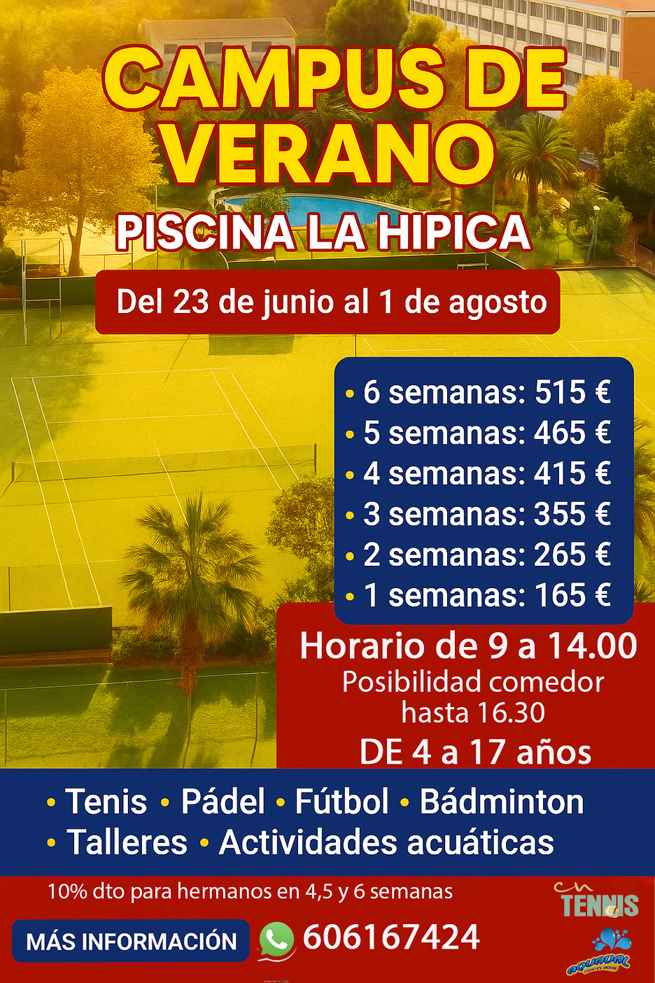 Los alumnos en el campus deportivo podrán disfrutar de múltiples actividades deportivas: Tenis, Padel Fútbol, Badminton, Actividades acuáticas